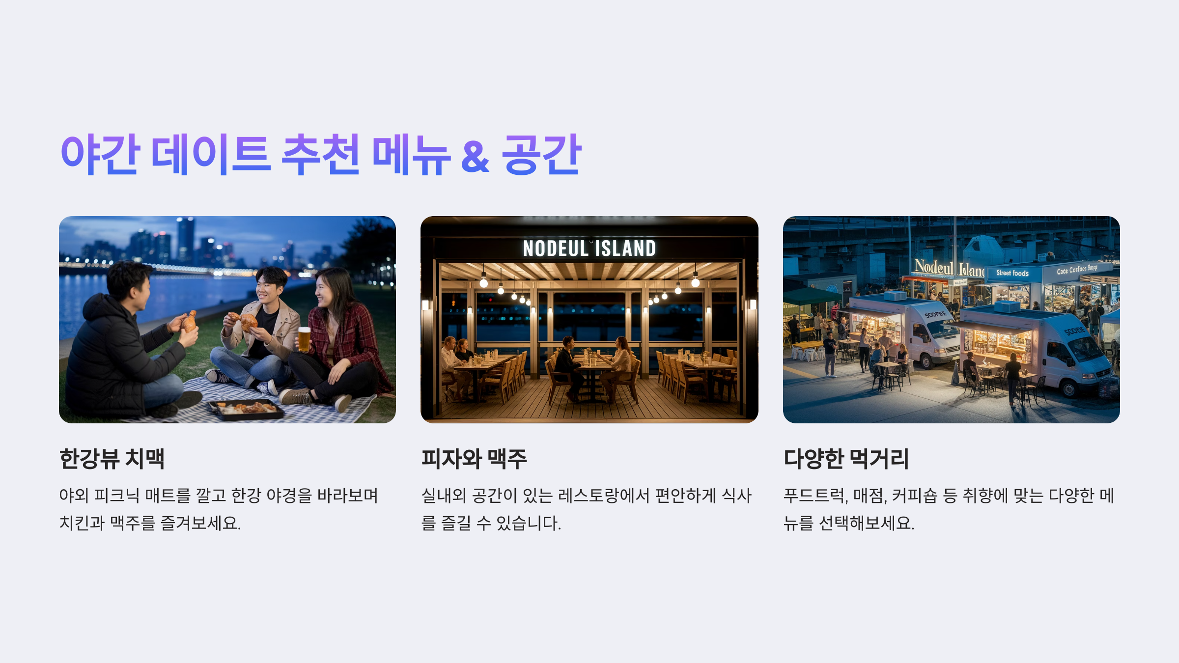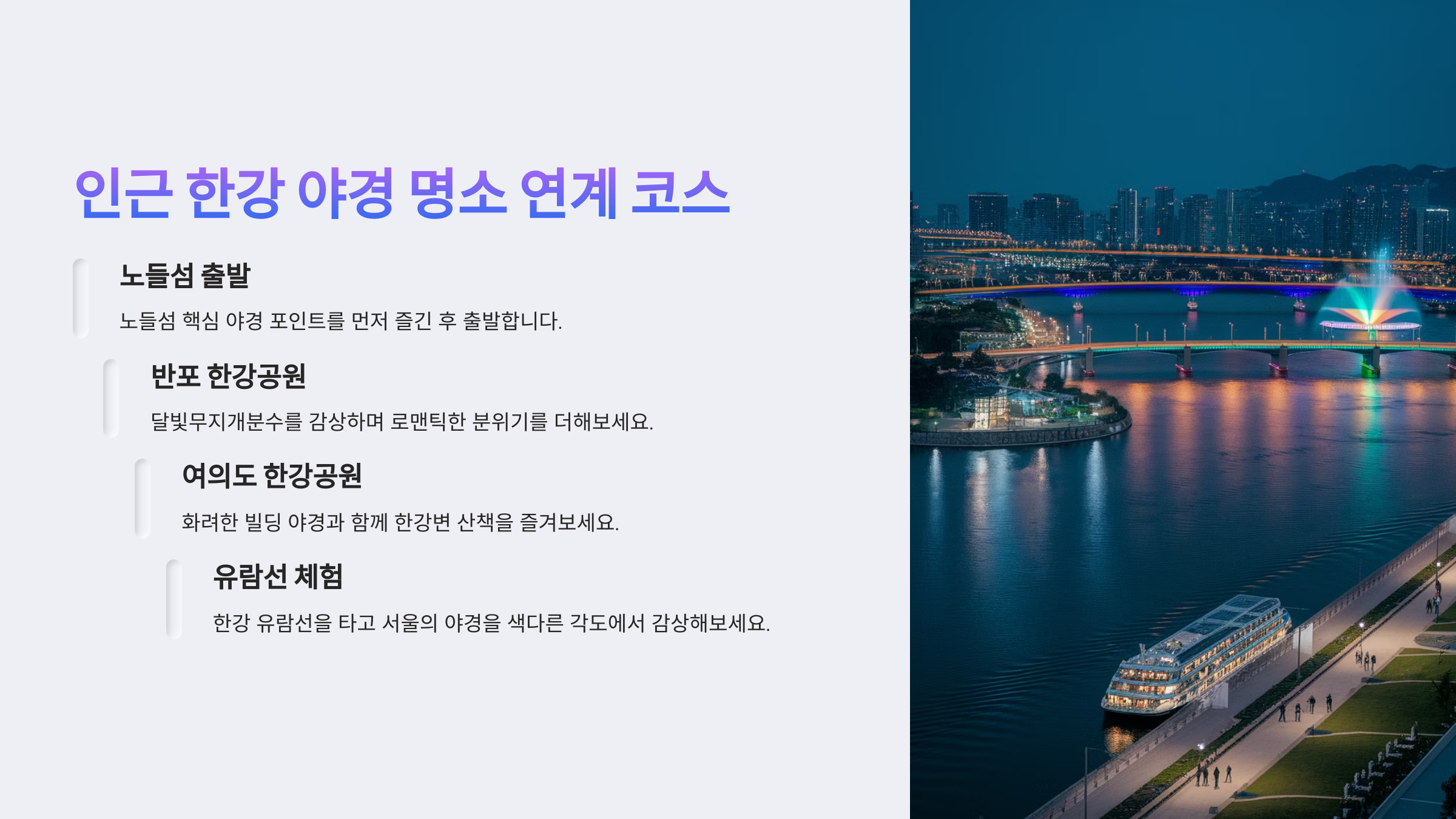 노들섬 야경을 감상한 후에는 여의도 한강공원으로 이동해 야경을 배경으로 치맥을 즐기는 것도 좋은 마무리가 될 수 있어요. 노들섬과 주변 명소를 연결해 야간 데이트 코스를 구성하면 더욱 풍부한 경험을 할 수 있답니다.