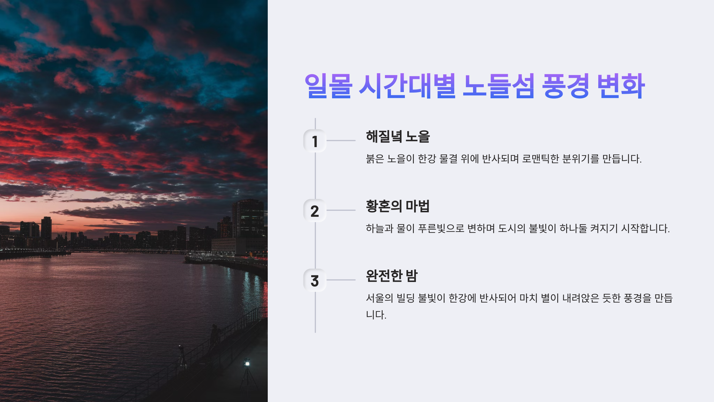 노들섬의 일몰 시간대는 계절에 따라 다르지만, 보통 저녁 7시 이후부터 여의도 빌딩 숲이 노을빛에 물들기 시작해요. 시간대별로 변화하는 노들섬 야경의 매력을 살펴볼까요?