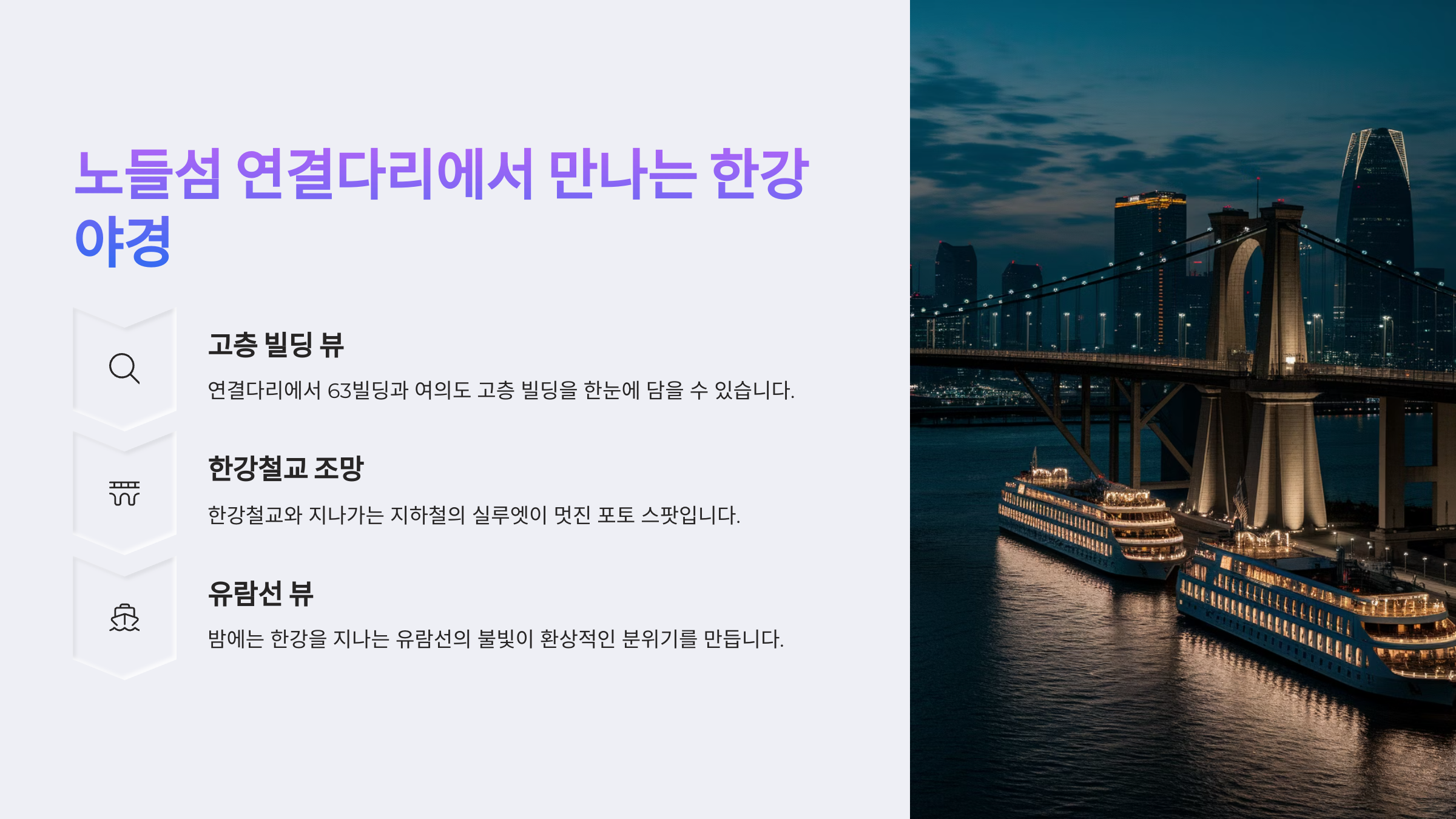 야간에는 조명이 비치는 빌딩을 배경으로 한 셀카나 그룹 사진을 찍는 것도 추천해요. 특히 연결다리에서 여의도 방향을 배경으로 사진을 찍으면 환상적인 결과물을 얻을 수 있습니다.