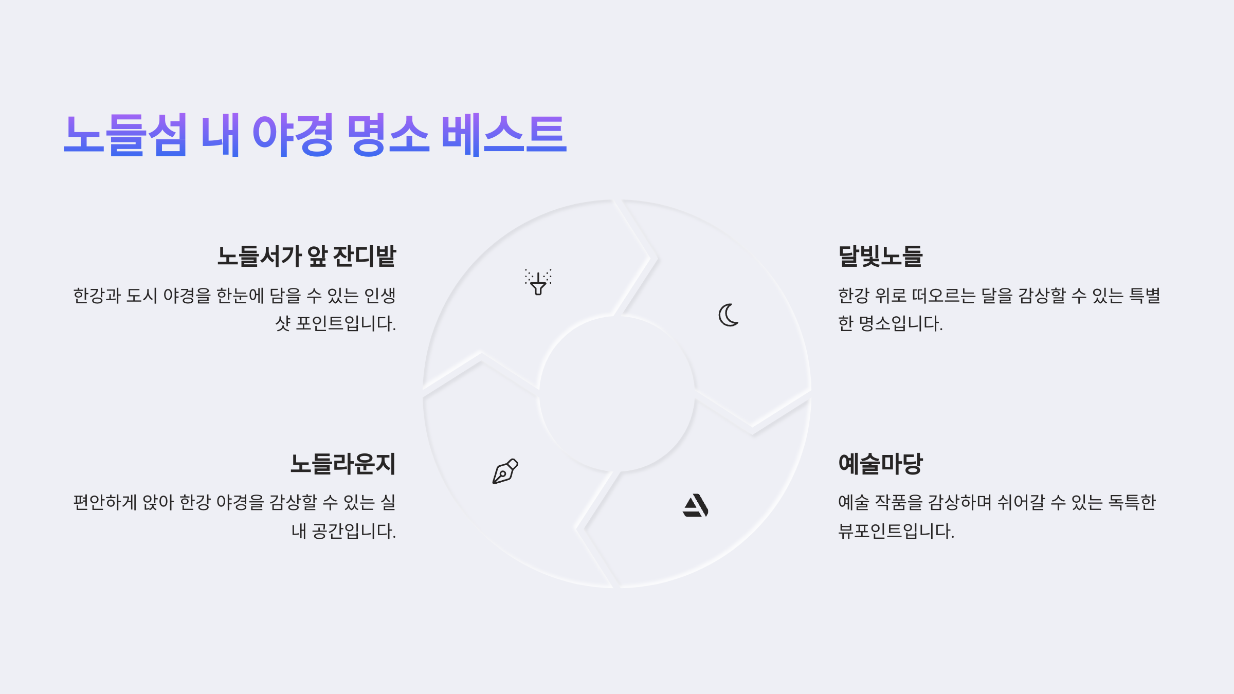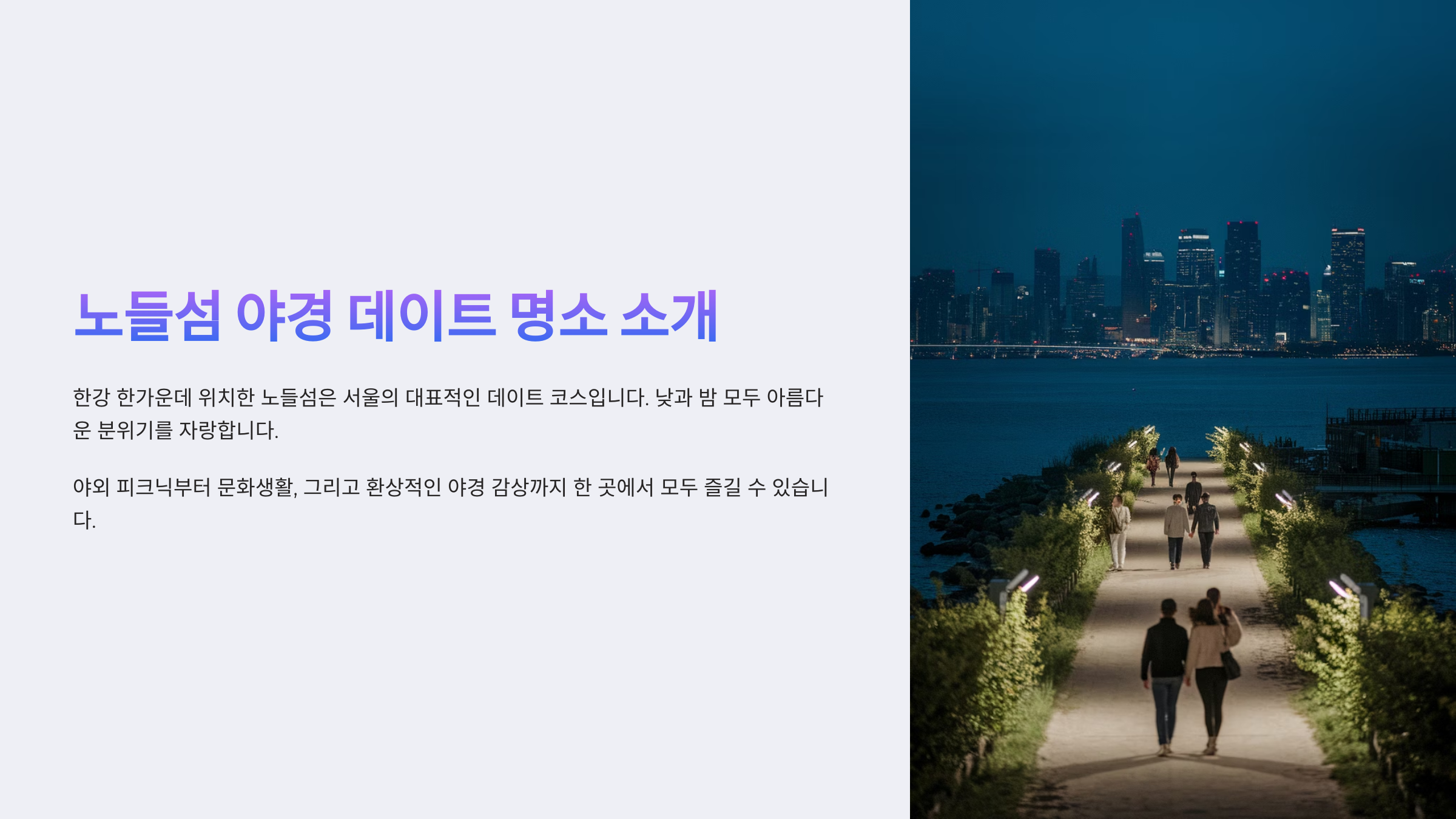 노들섬 야경은 서울에서 즐길 수 있는 가장 로맨틱한 데이트 코스 중 하나예요. 특히 일몰 시간에 맞춰 방문하면 한강과 여의도 빌딩이 만들어내는 황홀한 풍경을 감상할 수 있습니다. 연결다리에서 바라보는 야경, 잔디밭에서 즐기는 피크닉, 그리고 주변 한강 명소까지 연계한 데이트 코스는 특별한 추억이 될 거예요. 노들섬 야경의 로맨틱한 매력에 빠져보세요!