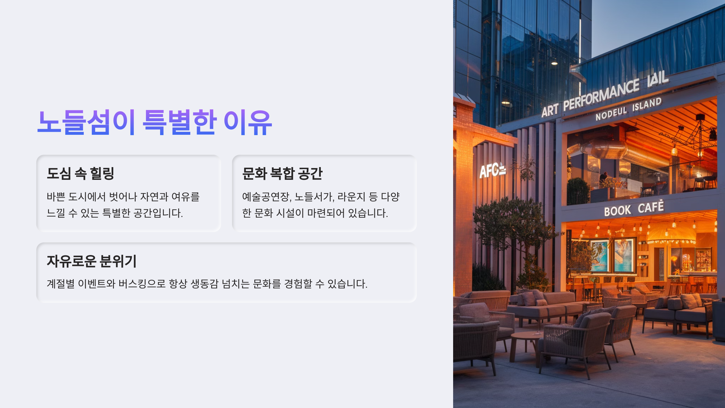 야간에는 한강을 바라보며 소주나 와인을 마시는 것이 로맨틱한 분위기를 더해줍니다. 특히 노들섬 내 카페에서 테이크아웃한 따뜻한 음료를 들고 연결다리를 거닐면 추억에 남는 데이트가 될 거예요. 단, 음식점 운영 시간은 저녁 8시까지로 제한될 수 있으니 미리 계획을 세우는 것이 좋습니다.