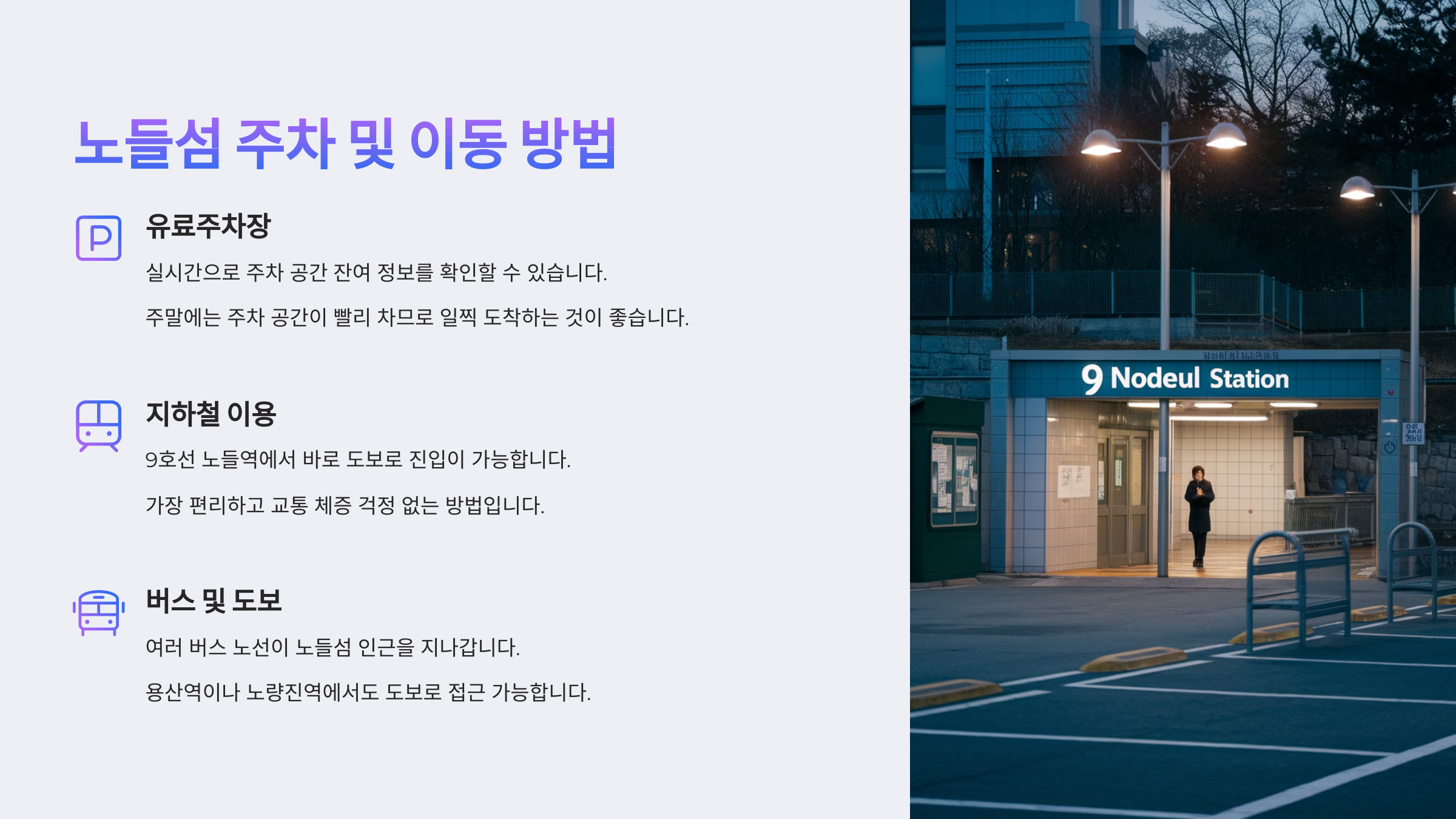 주차장 이용 시 주차 요금이 발생할 수 있으므로, 대중교통을 이용하는 것이 더 편리할 수 있어요. 특히 지하철 4호선 이촌역에서 도보로 이동하는 방법이 가장 편리합니다. 2번 출구로 나와 한강방향으로 약 10분 정도 걸으면 노들섬 입구가 보여요.